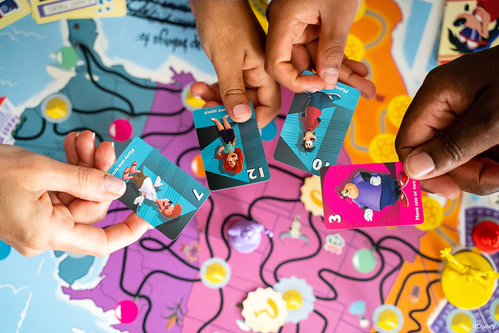 The die, meanwhile, has symbols representing Goofy and Powerline. If players roll the Goofy symbol, they’ll collect the Scrapbook Card from the color-coded spot next to the Goofy figure and then move the Goofy figure to the next color-coded spot on the board. If players roll the Powerline symbol, they’ll move the Powerline figure across his path at the bottom of the board (this path is separate from the paths the players are using). Some sides of the die have more than one symbol, so it’s possible both actions may take place in a single round.