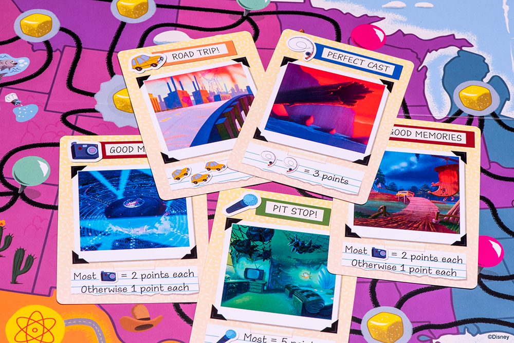 Depending on where players land on the map, they may be able to collect an additional Scrapbook Card, collect a bonus token or roll the game’s die. Bonus tokens can be used to earn bonus points at the end of the game, or they may allow players to instantly collect a Scrapbook Card of their choosing from one of the color-coded spots on the board.