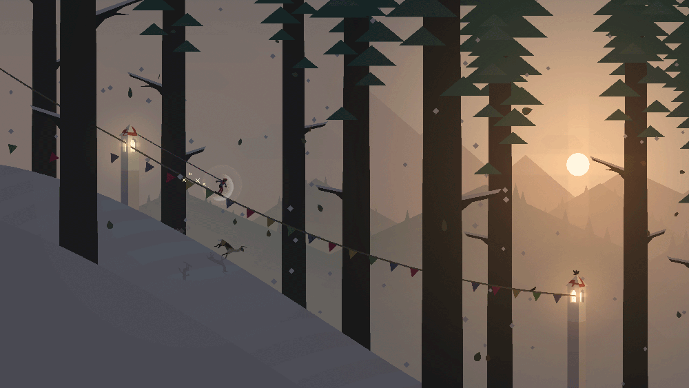 In Alto’s Adventure: The Spirit of the Mountain, players are challenged to retrieve their llamas that have broken out of a pen in the village at the top of a mountain. In each run of this endless snowboarding game, players are challenged to snowboard down the mountain for as long as they can without running into an obstacle, like a rock in the path, or falling into a chasm (players can jump off of ramps to clear large gaps in front of them).