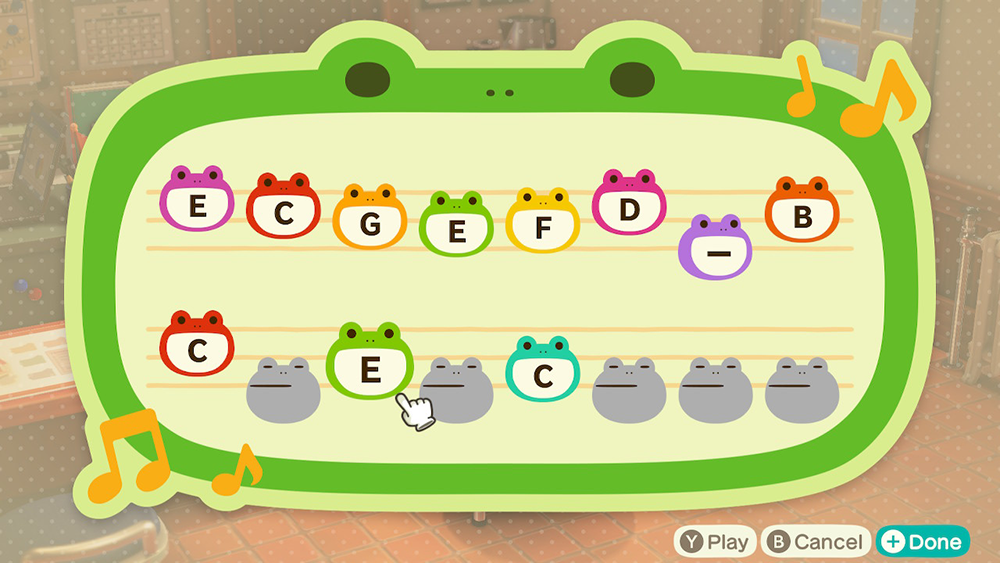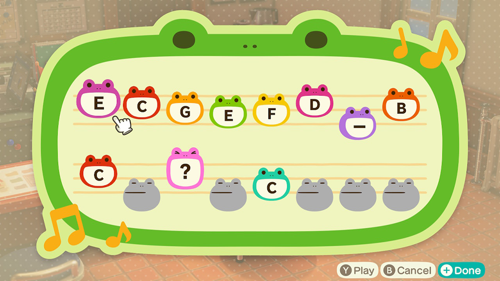 You’ll see a screen that displays your current island tune, laid out one note at a time. If you want to change a note, highlight it and press up or down to cycle through the available notes. As you’re working on the tune, you can preview it at any time by pressing “Y.”