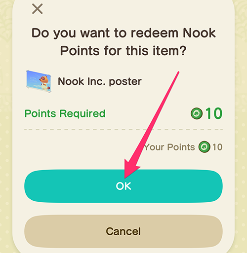 A confirmation screen will appear, asking you to confirm that you want to spend your Nook Points on the item you’ve selected. Tap “Ok” to finish your purchase.