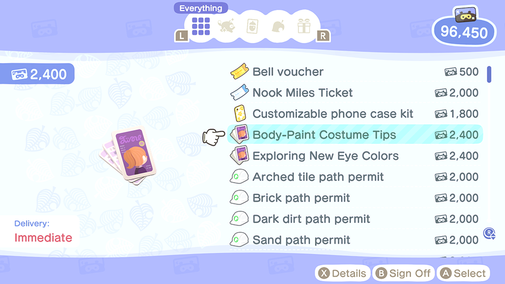 Now, select “Body-Paint Costume Tips.” This item costs 2,400 Nook Miles to purchase.