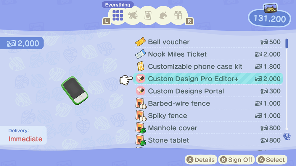 Move your cursor to the Custom Design Pro Editor+ option and press “A” to select it. It costs 2,000 Nook Miles to purchase.
