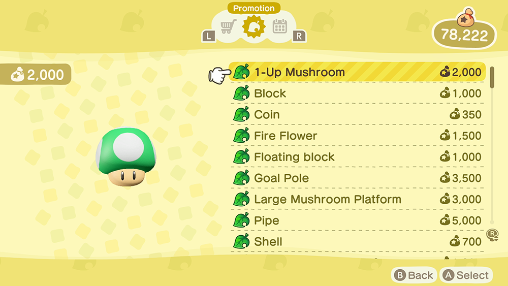 You’ll see all of the Super Mario-themed items that are available to purchase. Highlight the item you want to buy, and press “A” to select it.