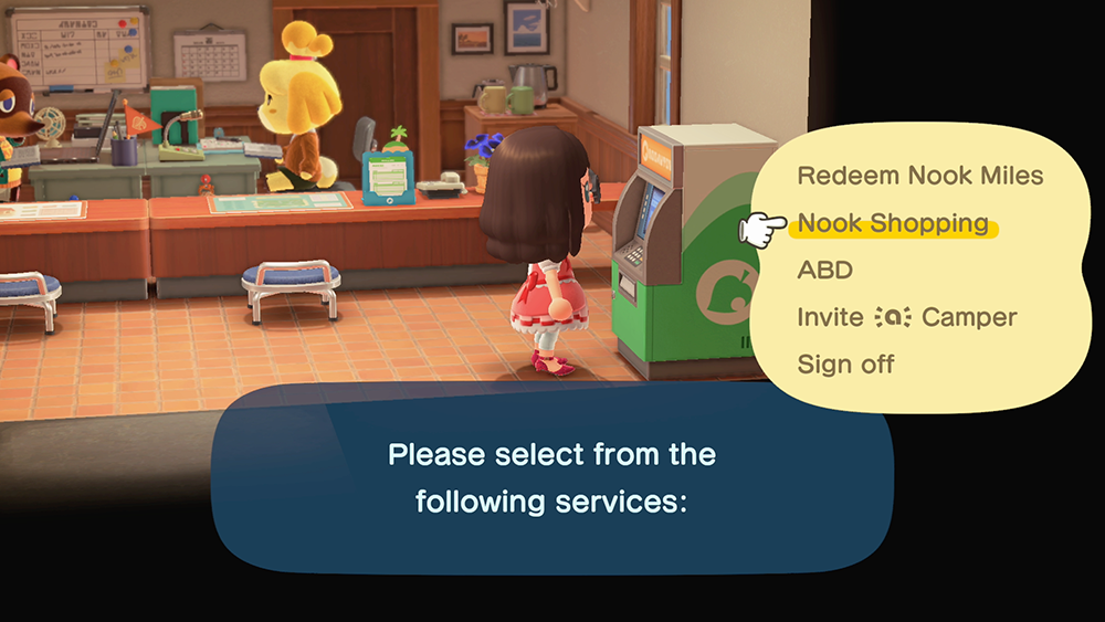 Choose “Nook Shopping.” (Remember, if you’ve unlocked the Nook Shopping app on your NookPhone, you can access the Nook Shopping catalog from anywhere, without being required to visit Resident Services.)