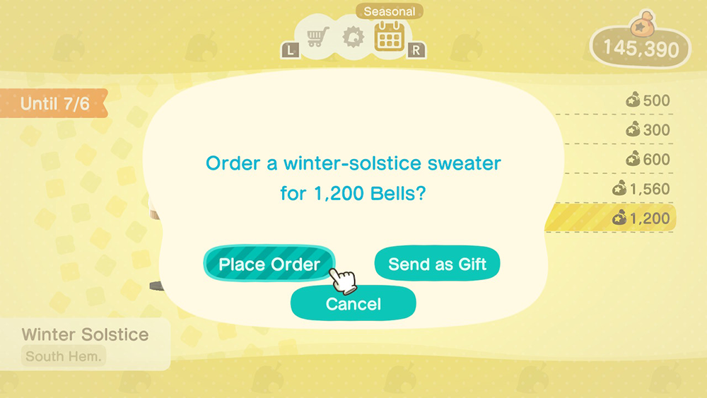 If you want to order the item for yourself (or to give it to someone at a later time), choose “Place Order.” If you want to send the item to someone as a gift right now, select “Send as Gift.” The Winter-Solstice Sweater costs 1,200 Bells.