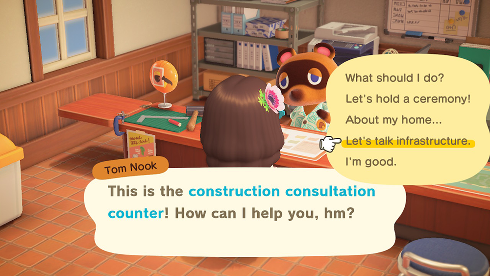 Talk to Tom Nook and select “Let’s talk infrastructure.”