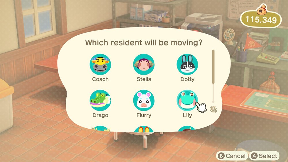 Now highlight the villager whose home you want to move and press “A” to select them.