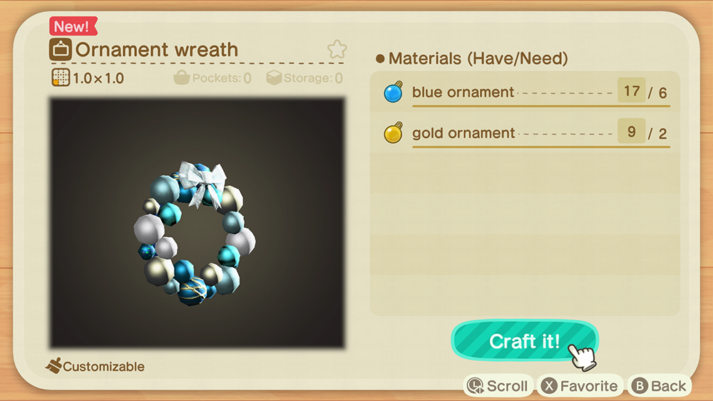 Isabelle will give you the first of these recipes — the Ornament Wreath recipe — as part of the game’s daily announcements. It requires six Blue Ornaments and two Gold Ornaments to create.