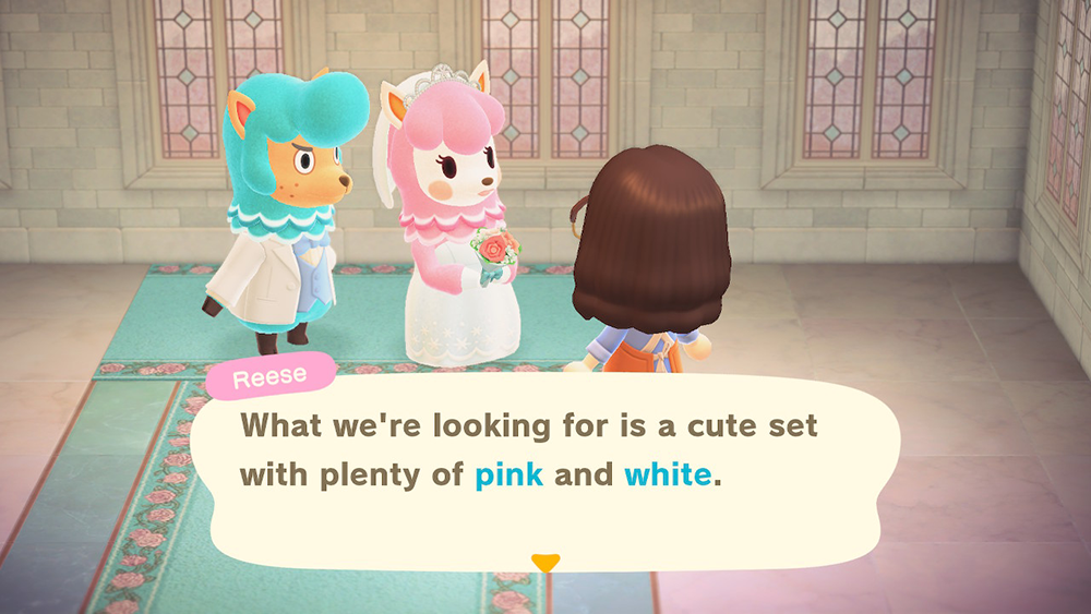 Cyrus, who is a carpenter in the Animal Crossing series, has built a variety of wedding-themed furniture and decorations that you can use to decorate the studio to look like a chapel. You can also add in any items that you have in your in-game catalog, though Reese does request that the set be filled with “plenty of pink and white.”