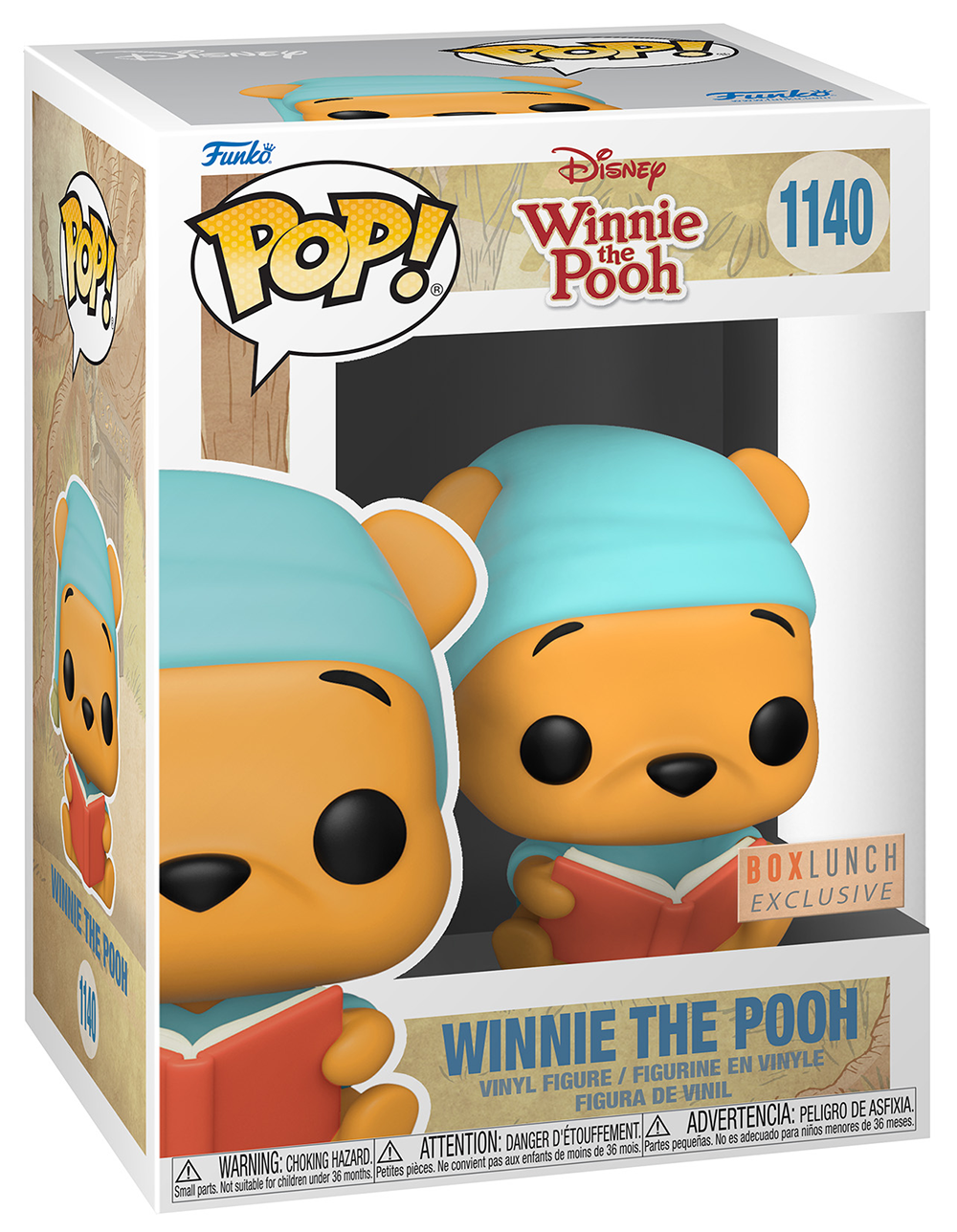 The Bedtime Pooh Bear figure features Pooh in a seated position. He’s wearing blue pajamas and a blue nightcap, and he’s holding a red storybook. This figure is shorter than some other Pop figures, since Pooh is sitting, rather than standing. It measures around 3.5 inches tall, when measured from the bottom of the figure to the top of Pooh’s cap. Unlike the heads on many other Pop figures, the head on the Bedtime Pooh figure does not turn.