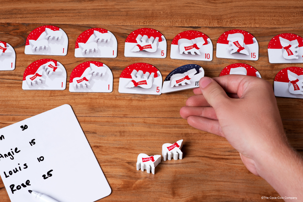 The Coca-Cola Polar Rollers Game is a “push-your-luck” tabletop game for 2-6 players with a recommended age of 13+. The game challenges players to be the first to score 100 points by rolling two polar bear-shaped “dice” and collecting point tiles based on how the dice land.