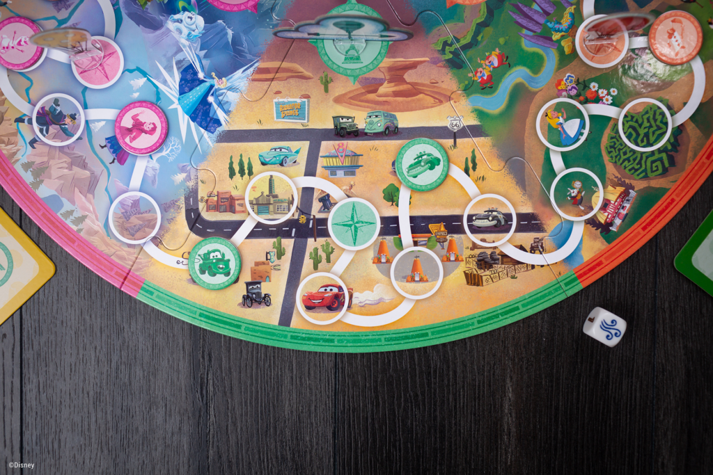 Disney Around the World features a large circular game board with six sections representing six Disney films and film franchises: Frozen, Cars, Aladdin, Toy Story, Moana, and Alice in Wonderland. Each section has spaces inspired by characters from the films. Before the game begins, six or more of the game’s stamp tokens are drawn randomly and placed on their corresponding spaces on the board (the number of Stamp tokens is determined by the number of players).