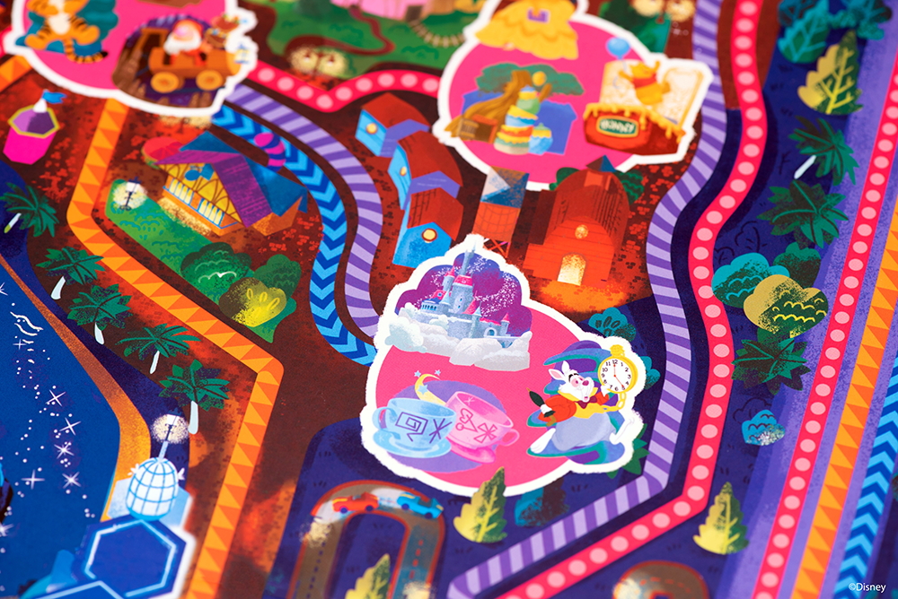 Each time players finish a turn on a train station space or at Cinderella Castle, the Tinkerbell Marker will move one spot closer to the top of Cinderella Castle. Once Tinkerbell reaches the top, the game board is flipped over and players can begin visiting attractions and characters around Magic Kingdom Park at night. While the board’s general setup remains the same at night, the characters will move to different spaces at night and some of the paths between spaces may have changed color between day and night.