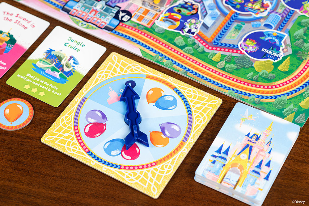 The game’s spinner features spots that allow players to collect the colorful balloon tokens they need to move throughout the park. The spinner also has a spot that features a picture of Cinderella Castle alongside a question mark symbol. When the spinner lands on this spot, players can either travel to Cinderella Castle to draw more cards or answer the question at the bottom of one of their cards to instantly travel to the matching location on the board. These questions are open-ended and will encourage families to talk about their favorite attractions, foods, and more around the Magic Kingdom Park.