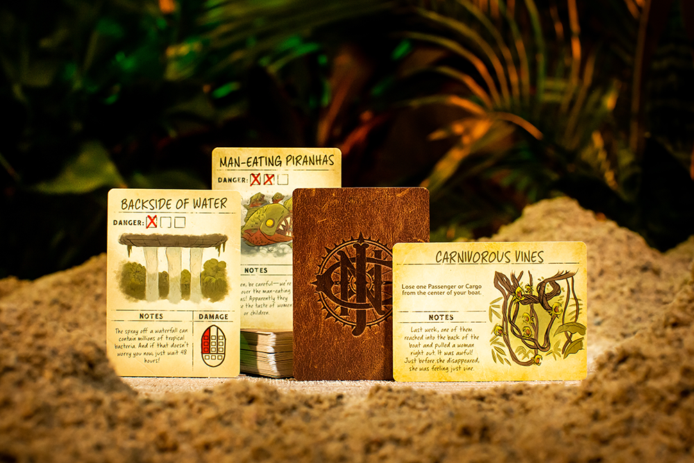Dangerous navigation cards have a danger rating of 1-3, and when players encounter (act on) one of these cards, they’ll need to roll the associated number of “Peril Dice.” Depending on the results of the dice roll, players may need to remove a passenger or piece of cargo from their boat. Each card is associated with a different area on the boat (Starboard, Port, etc.), so when players are required to remove one or more items, they must do so from the matching area of the boat (unless that section of the boat is already empty).