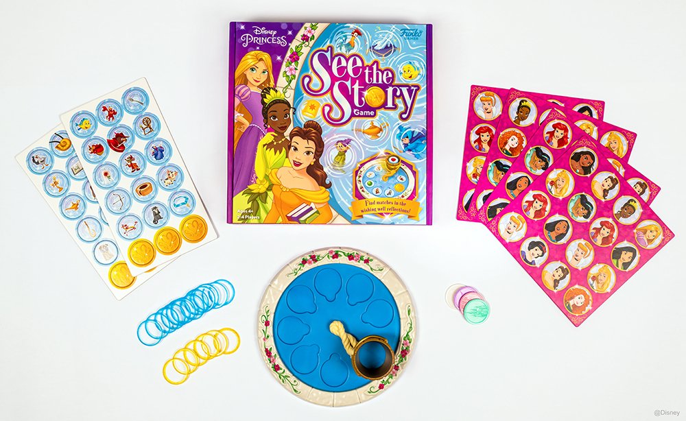 Disney Princess See the Story is a kid-friendly tabletop game designed for 2-4 players aged 4+. It challenges players to match images from 12 animated Disney films (each one associated with a different Disney Princess) to collect coins that they can place on their Disney Princess board, which is similar to a Bingo board.