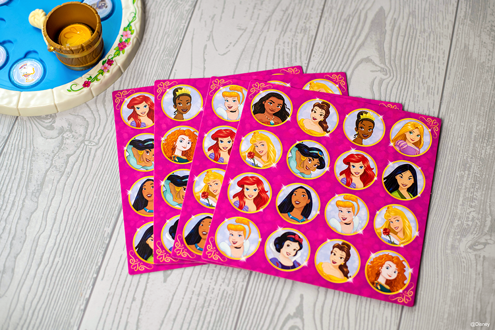 If the match is correct, they can take one of the two coins from the well and place it on their personal Disney Princess board, which features 16 images of Disney Princesses (some Princesses are featured more than once on each board). They need to place the coin on top of the Princess from the same film. In our above example, the player may take the Sebastian coin and place it on the image of Ariel. The other coin (in this case, Flounder) is placed back in the bucket on the well.