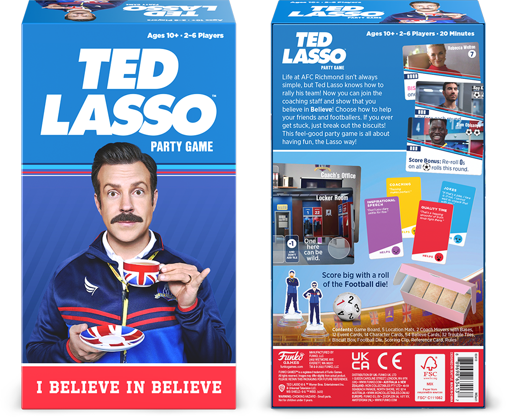 Next, the Ted Lasso Party Game will allow 2-6 players aged 10+ to become members of the AFC Richmond coaching staff and work together to complete tasks. The inside of the game’s box will be designed to look like the AFC Richmond stadium, and the game will also include a soccer ball-shaped die.