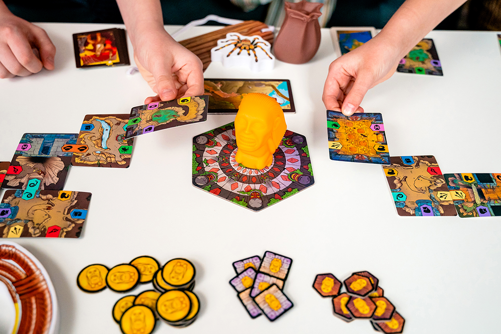 First, the Temple Race will see both teams play Temple Cards as quickly as possible to form a path for their team to reach the golden idol in the center of the table or gameplay area. Each Temple Card has a number of colorful doorways positioned alongside the outside edges of the card, and each doorway features a symbol, such as a skull or spider.