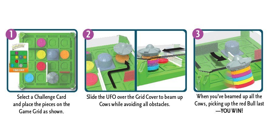 In Invasion of the Cow Snatchers, players must abduct each of the magnetic cows, finishing the puzzle by picking up the red bull token. Each puzzle includes a variety of barriers that allow different numbers of cows to pass over them while carried by the UFO (which itself contains a powerful magnet and sits atop the clear lid).
