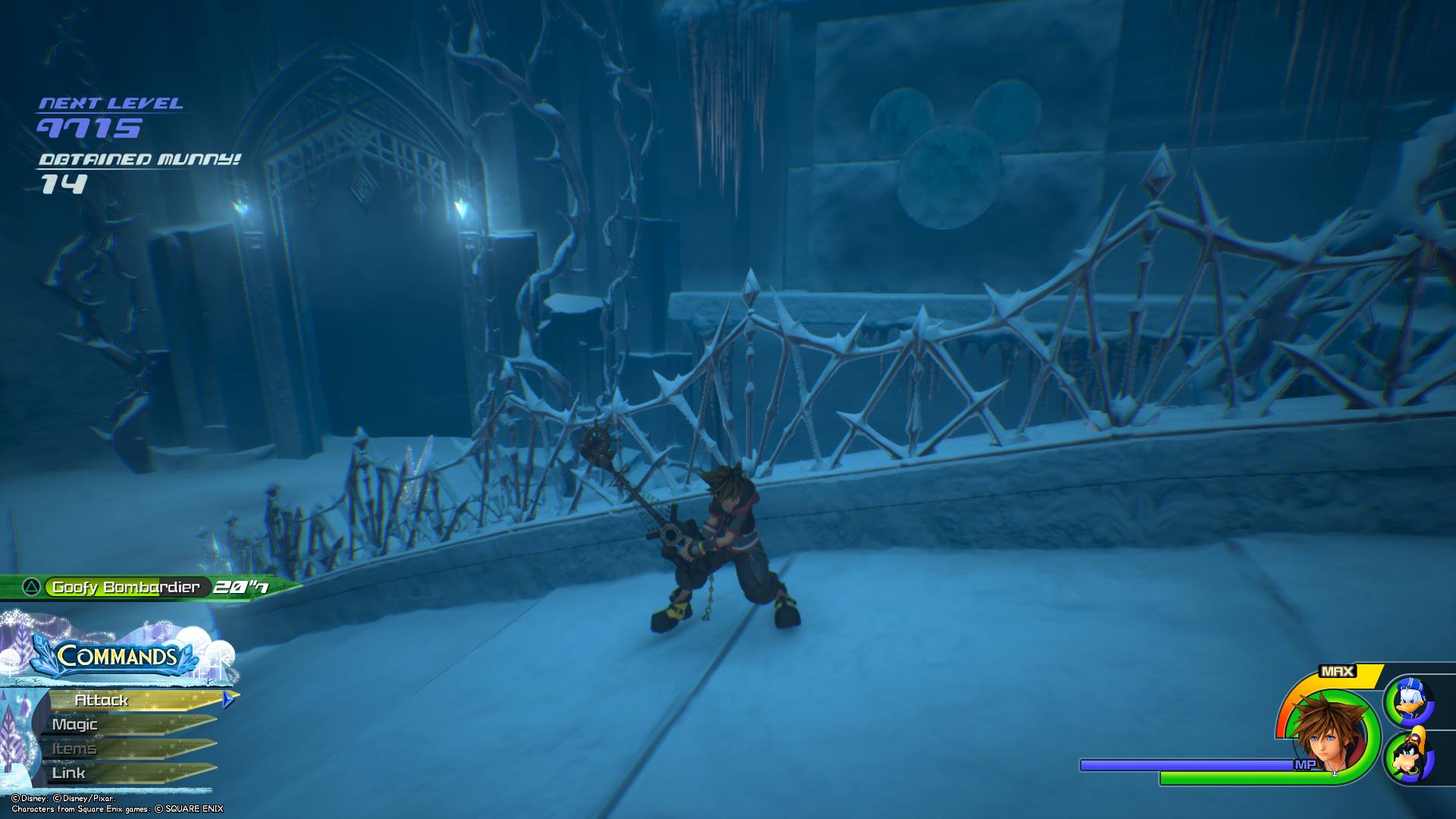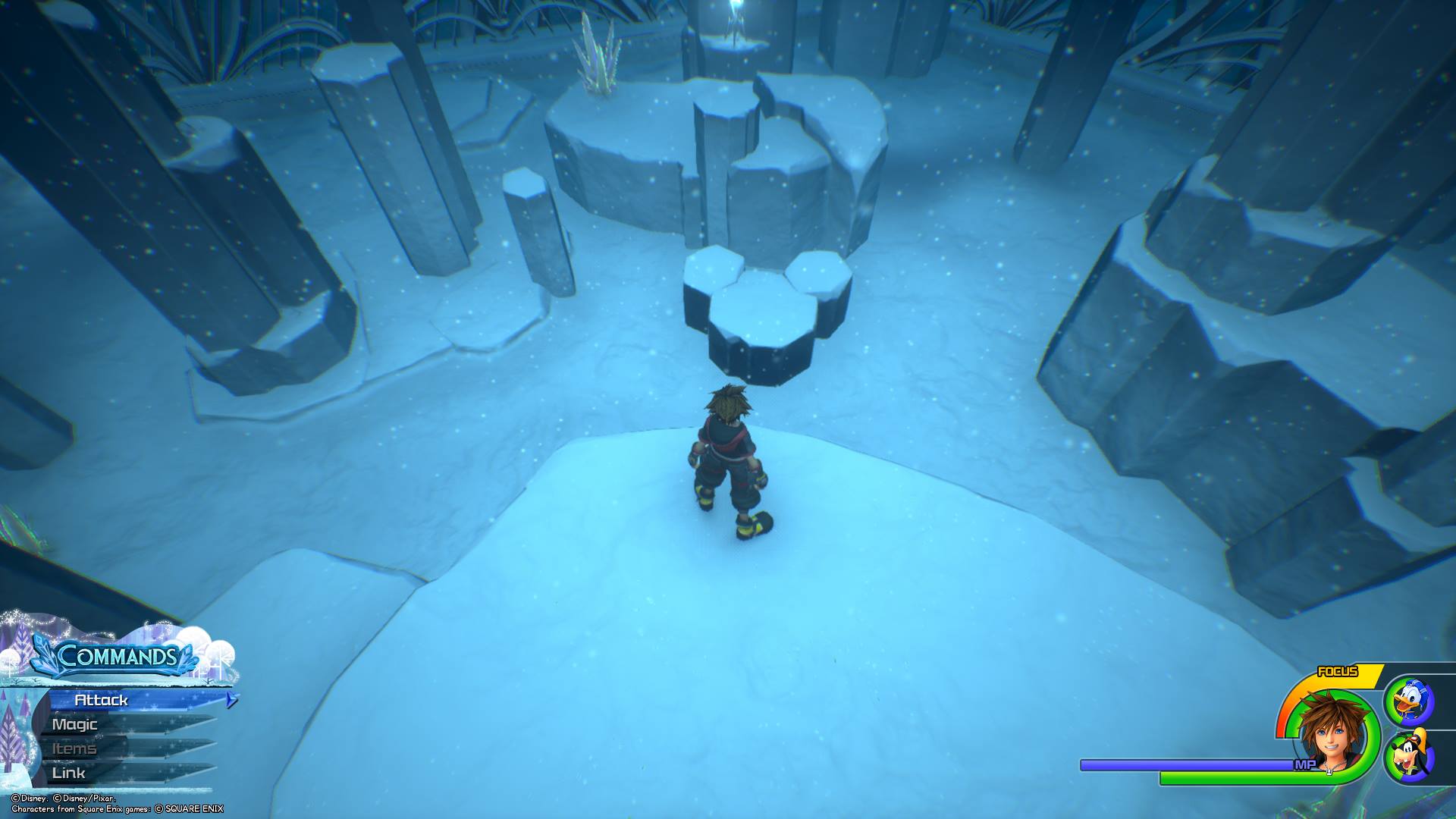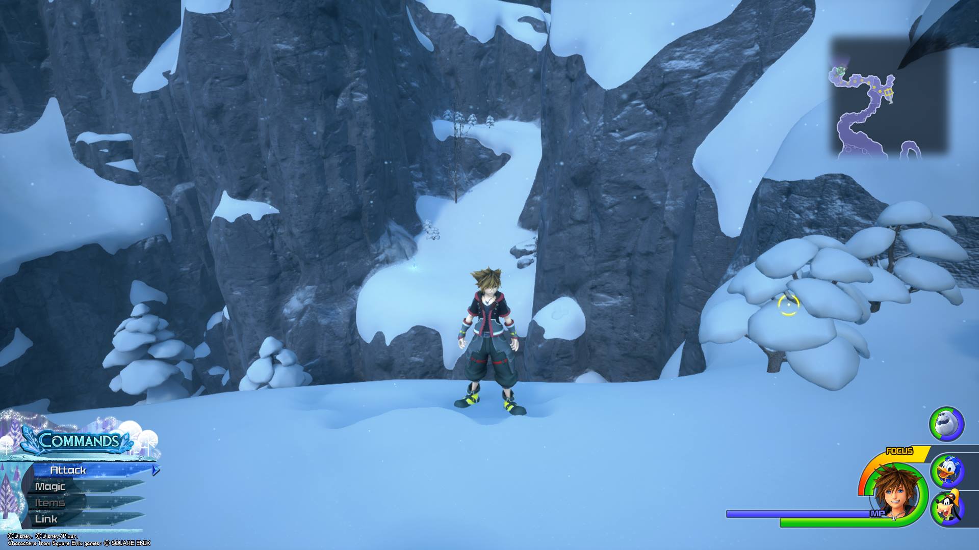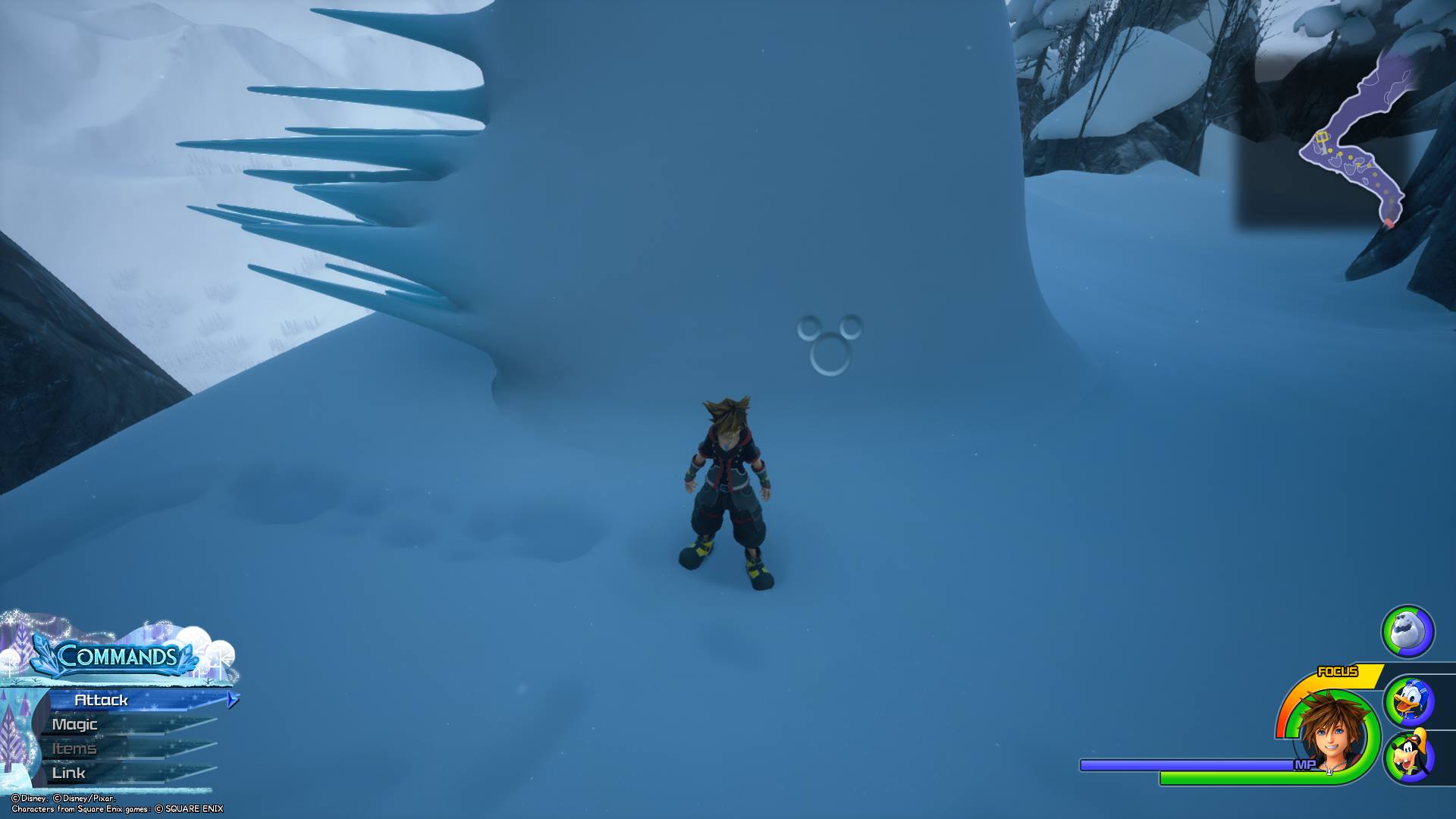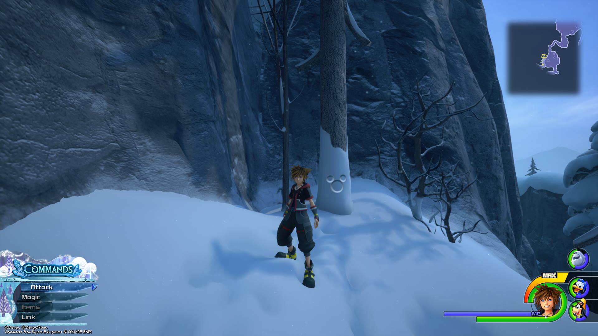 After photographing Lucky Emblem No. 7, turn right and make your way down the mountain until you come to a clearing where large enemies spawn, and you can see a tall rock wall to Sora’s right that you can climb. Climb the wall and run to the right (while on the wall). You should see a short rocky slope Sora can slide down to land on a ledge sticking out from the wall. Once you land on this platform, the next Lucky Emblem is made out of snow on the wall.