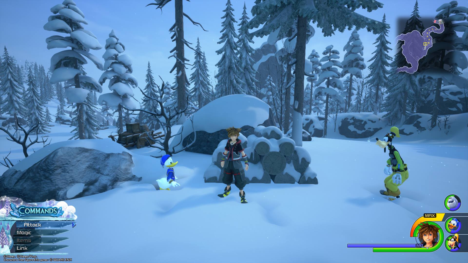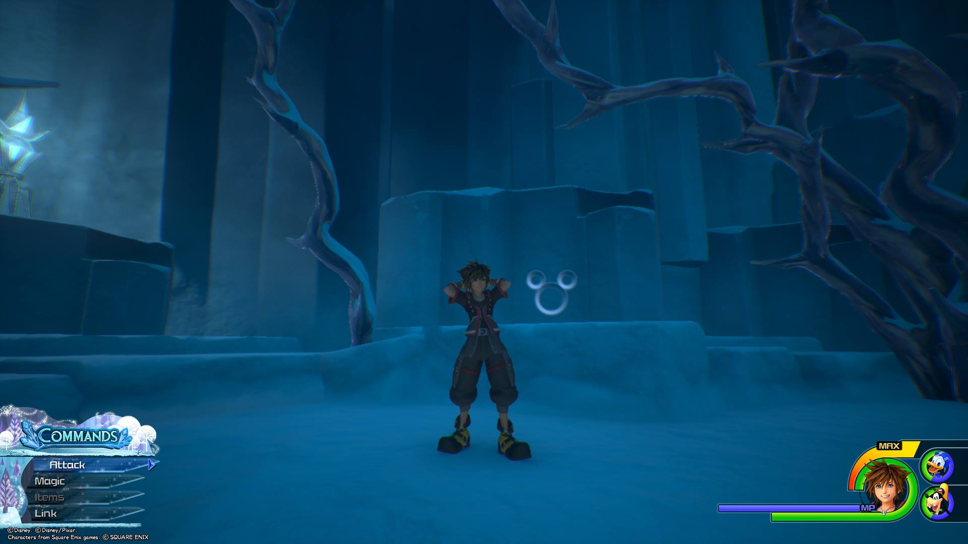 After taking a picture of Lucky Emblem No. 9, it’s time to warp again. Make your way back to the Snowfield save spot and warp to the Foothills save spot. Once there, run down the narrow path nearby to move into the “Foothills” area. Run forward for a short distance, until you see a treasure chest sitting on top of a large group of rocks on Sora’s left. Climb the rocks so that you’re next to the treasure chest, and then look down at the ground. You’ll see Lucky Emblem No. 10 on top of a rock below you.