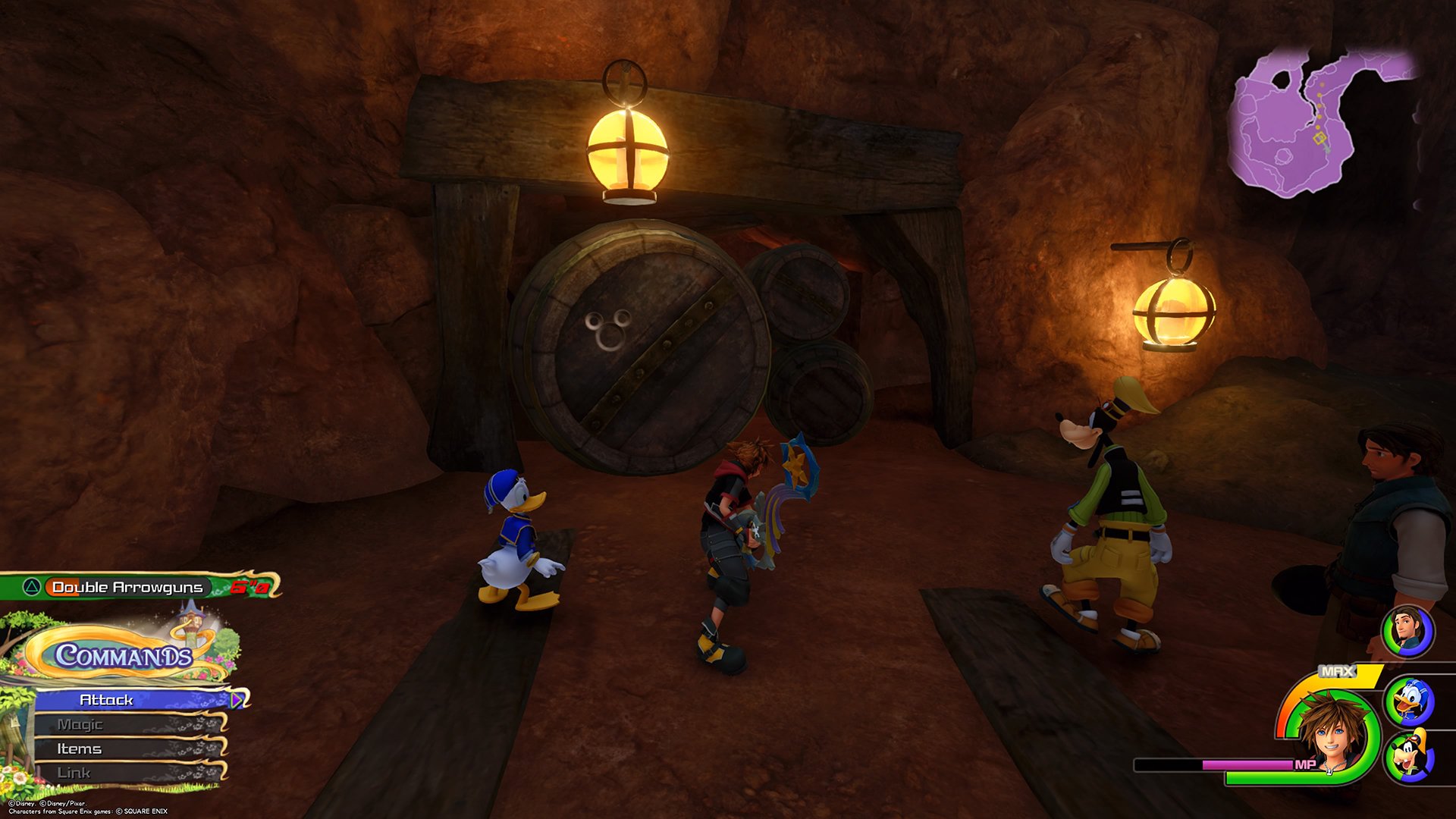 Once you enter the mines, look for a large barrel sticking out of the wall on Sora’s left. The third Lucky Emblem is on the end of the barrel.