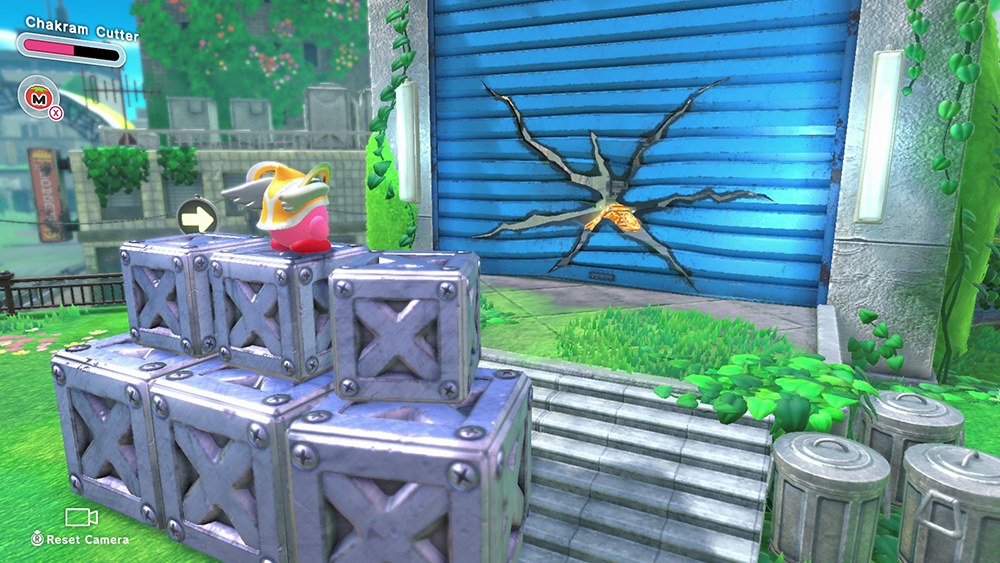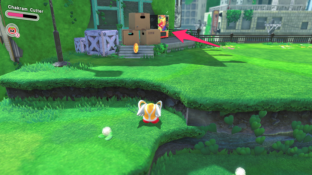 To break the shutter, you can use Kirby’s Mouthful Mode ability to inhale the vending machine to the left of this building. Specifically, the vending machine can be found close to some cardboard boxes near where you scaled the cliff.