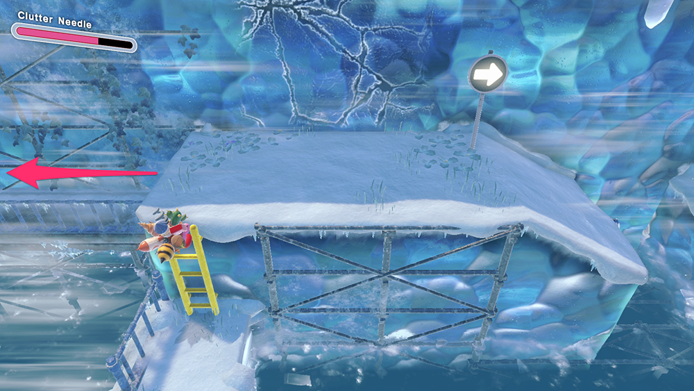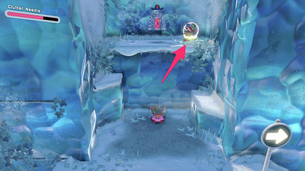 The cave can be found near the end of the first area in the Windy, Freezing Seas level. You can reach the entrance to the cave by turning left once you climb a ladder near the end of the area. The platform with the ladder is the same platform you can reach if you use Kirby’s “Pipe Mouth” ability to roll the large pipe off of a ramp to break the cracked wall nearby. We’ve marked the path that leads to the cave’s entrance with an arrow in our screenshot below.
