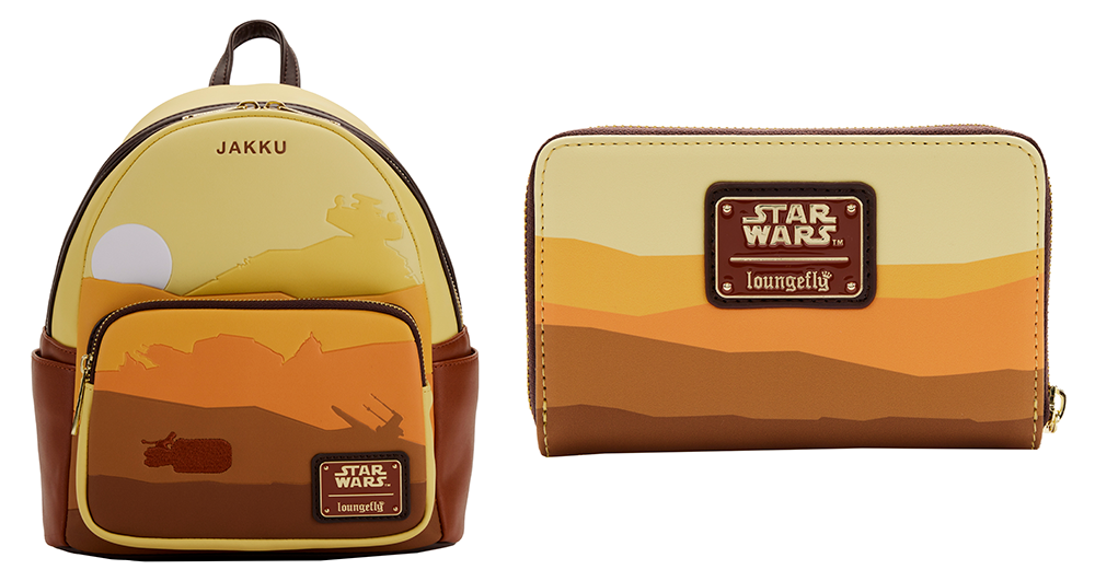 Next, Loungefly revealed two items in a “Star Wars: Lands Jakku” set: a mini backpack ($75) and a wallet ($40). These items have a brown, orange, and yellow color scheme, and feature a pattern inspired by Jakku’s landscape. Beginning May 4, fans will be able to sign up to be notified when these items become available.