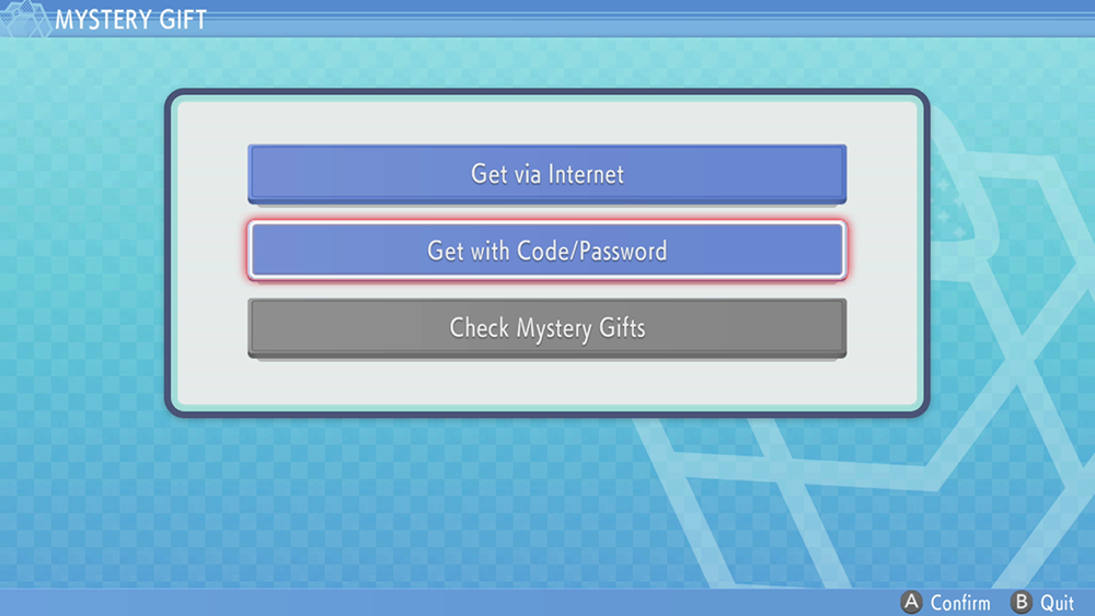 In order to collect these free statues in Pokemon Brilliant Diamond and/or Shining Pearl, open the game’s Mystery Gift menu and choose “Get with Code/Password.”