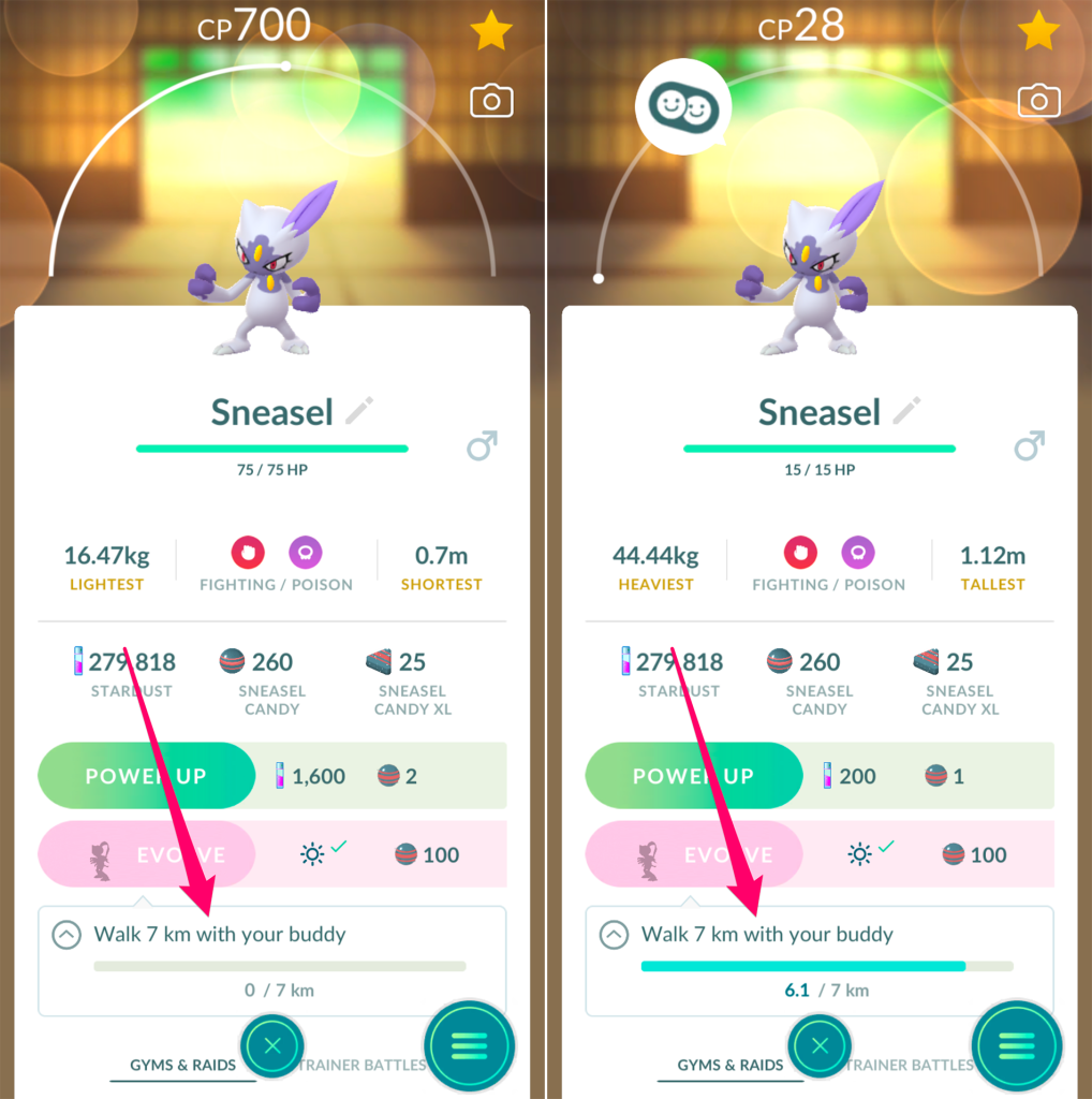 When you tap on the Hisuian Sneasel you want to evolve in your Pokemon inventory, you’ll see the phrase “Adventure together to evolve” under the Pokemon’s “Evolve” button. When you tap this phrase, you’ll see how far you’ve walked with Hisuian Sneasel as your Buddy.