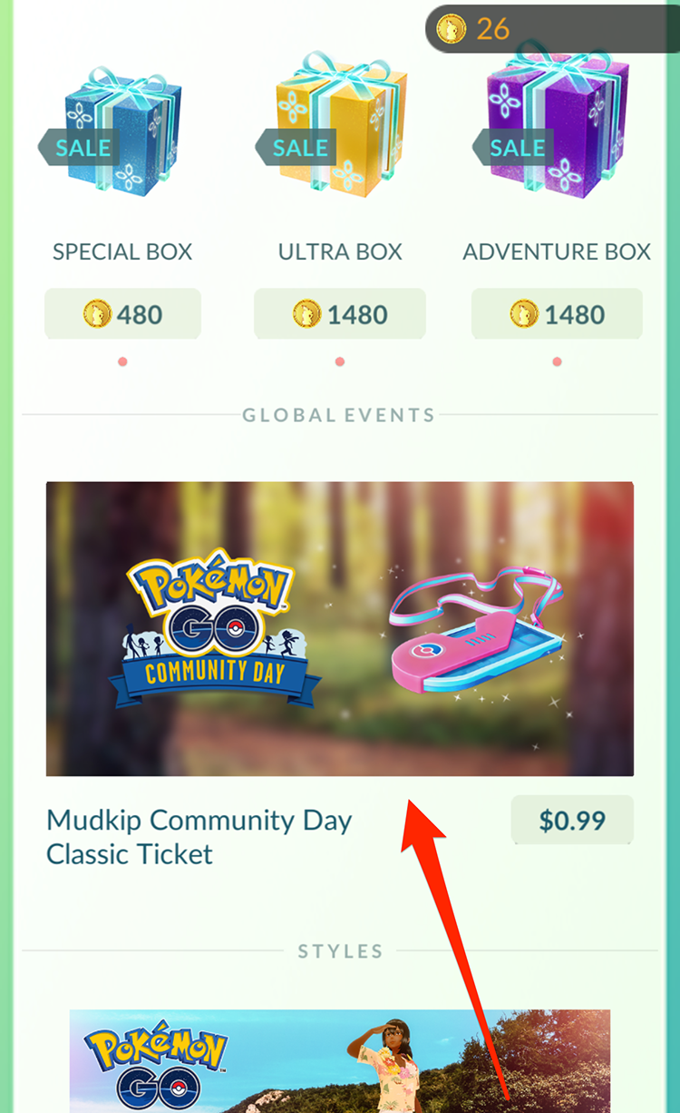 Scroll down to the “Global Events” section and tap the “Mudkip Community Day Classic Ticket.”