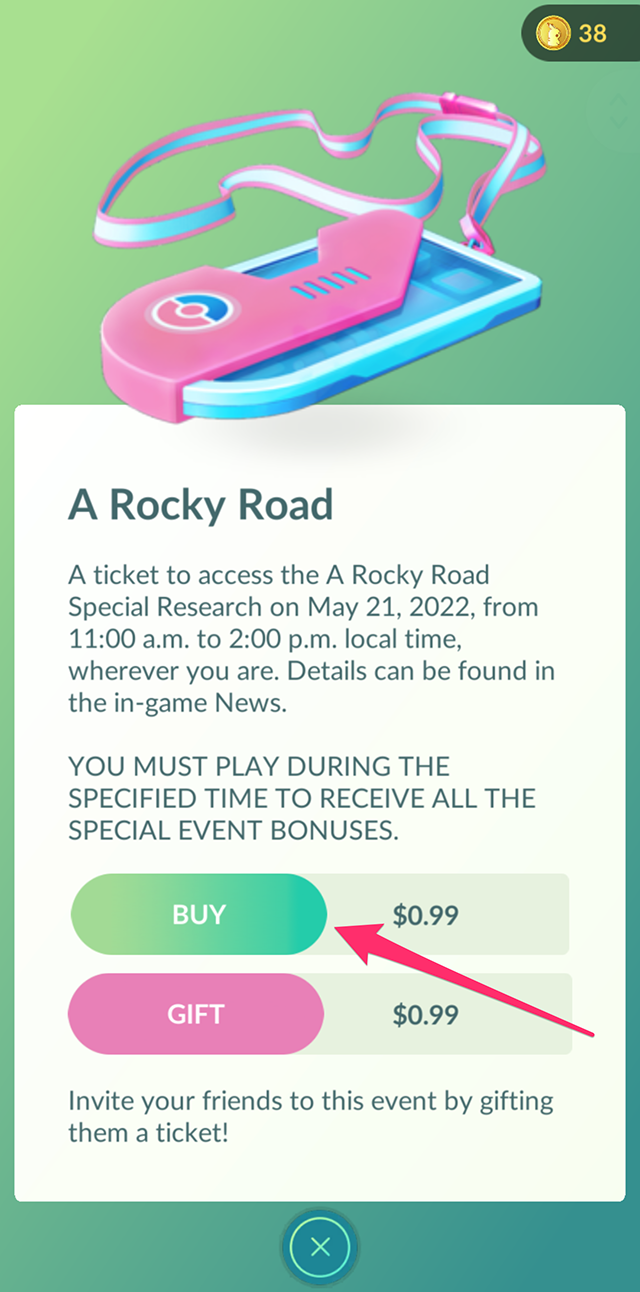 If you purchase the “A Rocky Road” ticket for yourself, you’ll need to login to Pokemon Go on May 21, 2022 between 11 a.m. local time and 2 p.m. local time to actually receive the Special Research.