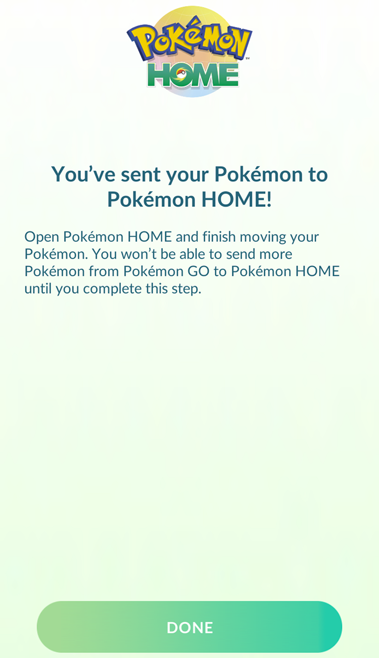 Once you tap “Transport,” you’ll see a short animation of your Pokemon being transferred, and you’ll receive a Pokemon Candy for each Pokemon you sent into Home.