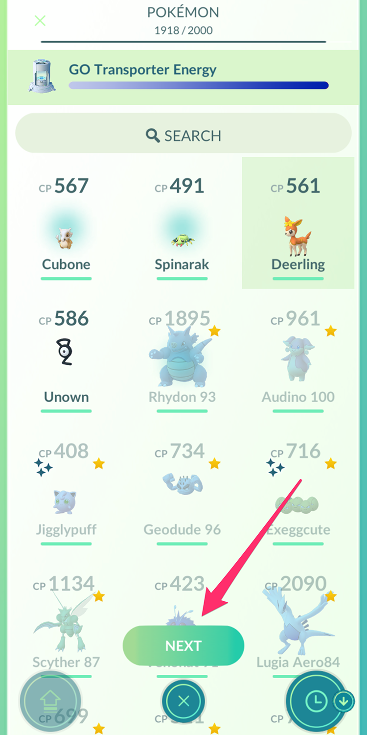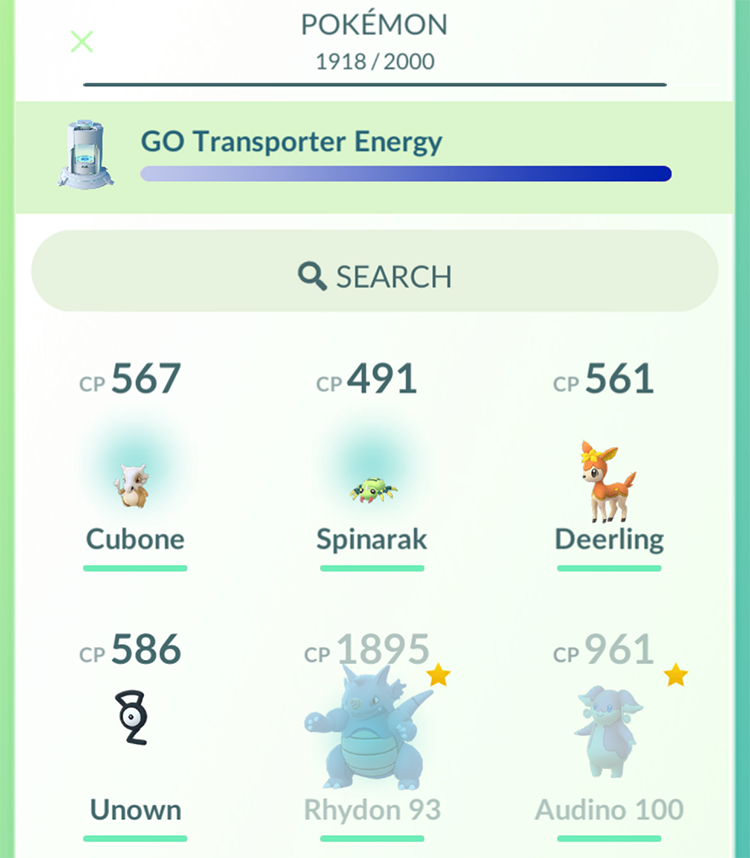 This will open up your Pokemon collection, with all of the Pokemon that are eligible to be transferred being shown at the top of your list. Tap one or more Pokemon to select them for transfer. As we said before, each Pokemon you transfer will require a different amount of Transporter Energy. For instance, transferring a Legendary Pokemon requires far more Energy than transferring a normal one.