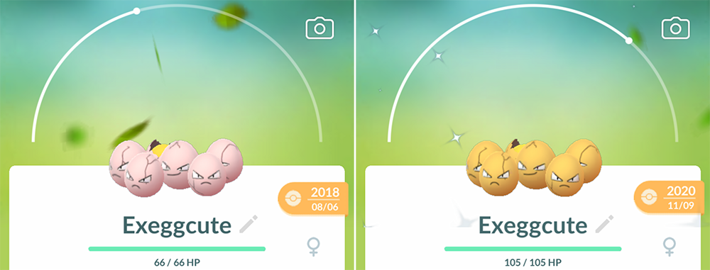 Shiny Exeggcute is available in Pokemon Go. Shiny Exeggcute is gold, rather than pink.