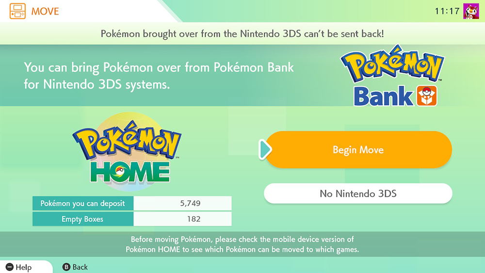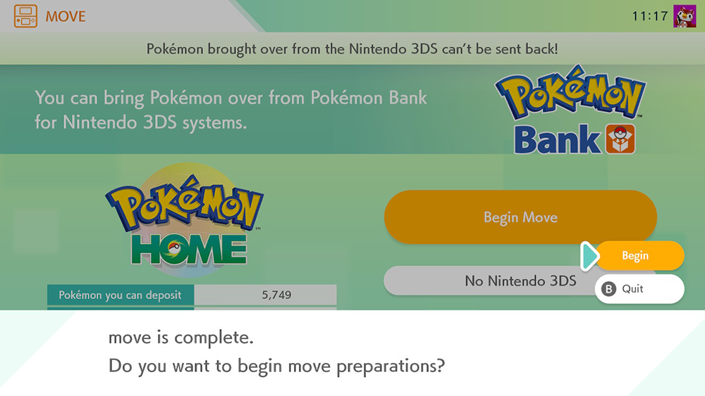 Pokemon Bank will warn you that if you move Pokemon from Pokemon Bank into Pokemon Home, you won’t be able to move them back again. Select “Begin” on this screen to move on.