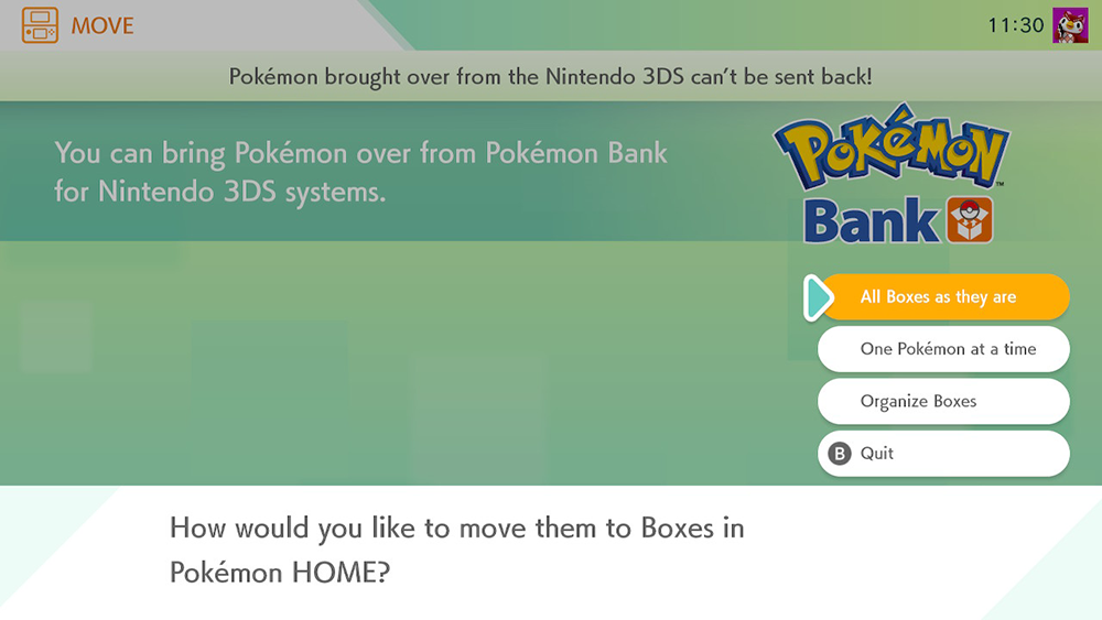 After the move has been completed, the next time you open Pokemon Home, you’ll be asked how you would like to organize your transferred boxes into Pokemon Home. Select “All boxes as they are,” “One Pokemon at a time,” or “Organize Boxes,” depending on how you want this to work.