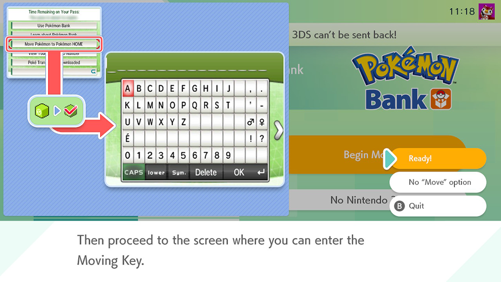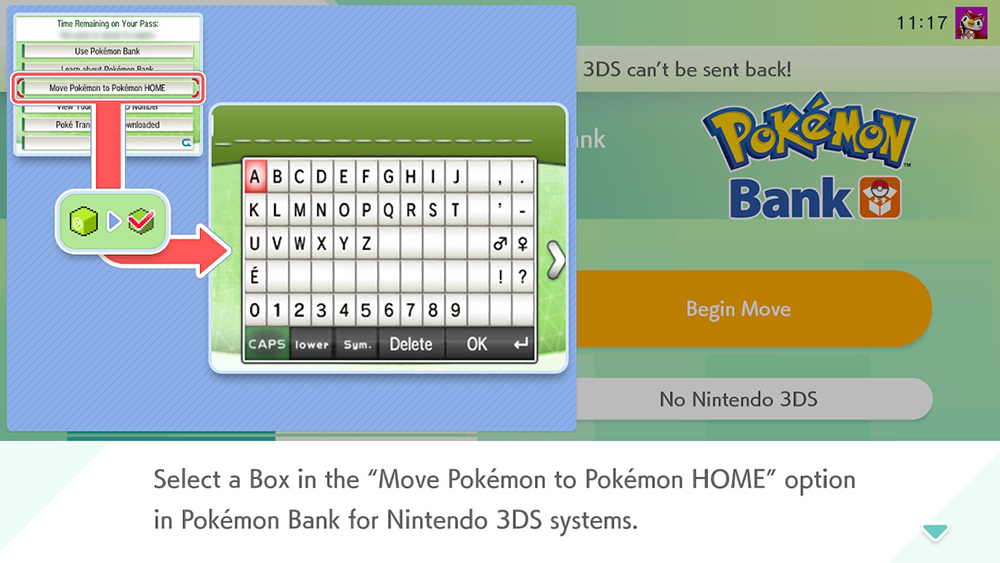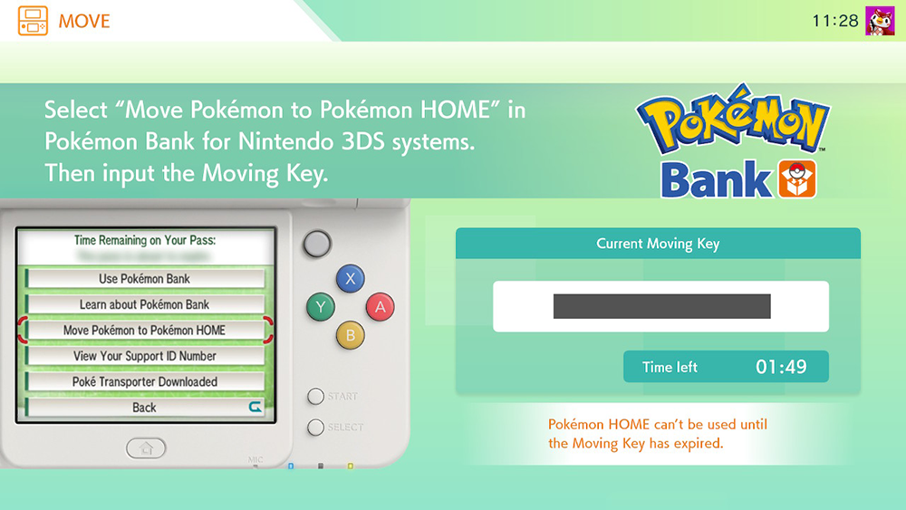 Pokemon Home on Switch will now direct you to use Pokemon Bank on the 3DS to continue the moving process until you’ve reached the point where you’re given the chance to enter a Moving Key. Then, you’ll need to come back to the Switch to finish the moving process.