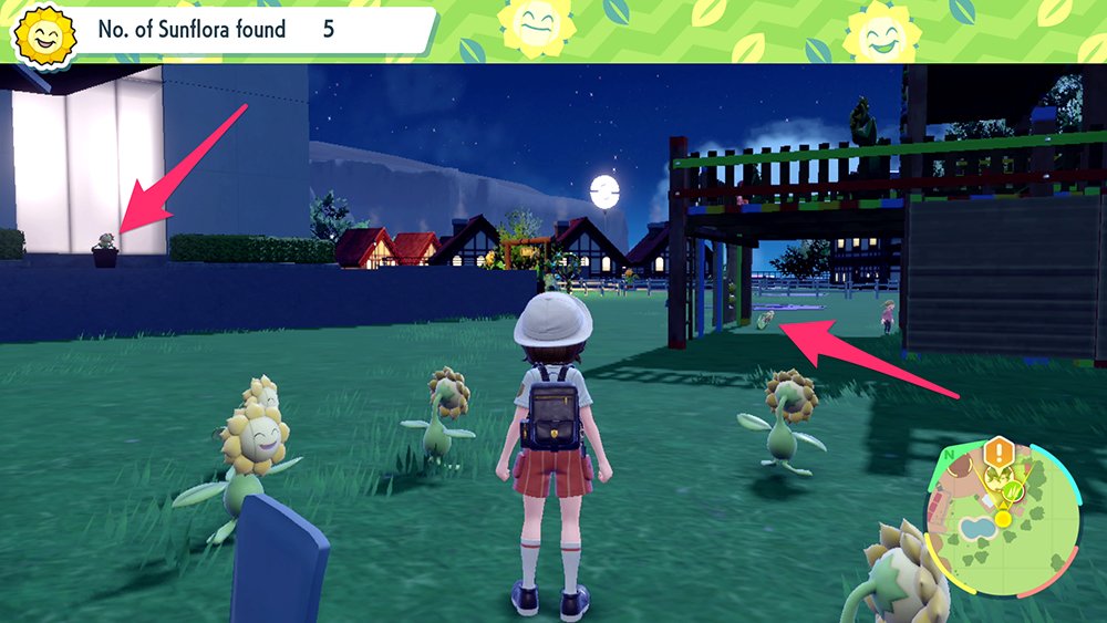 From there, walk forward onto the path and turn slightly to the left. You’ll see a Sunflora hiding near a lamp post.