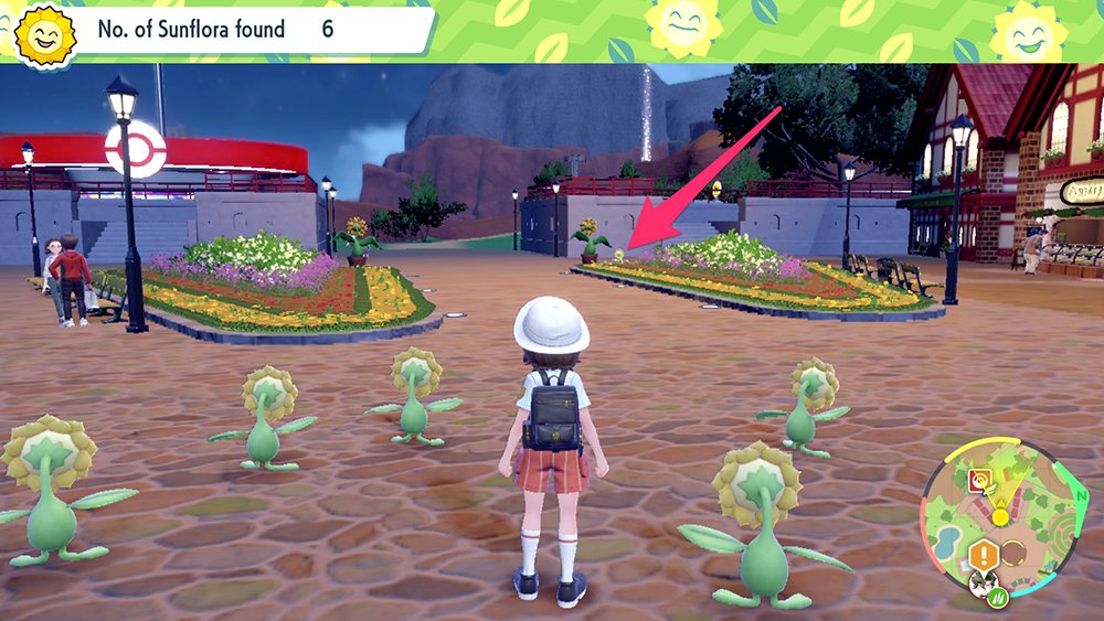 In the plaza near the “Artazon (West)” Pokemon Center, a Sunflora can be found standing next to a Sunflora statue and flower garden.