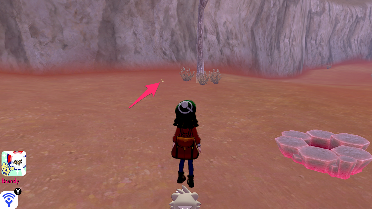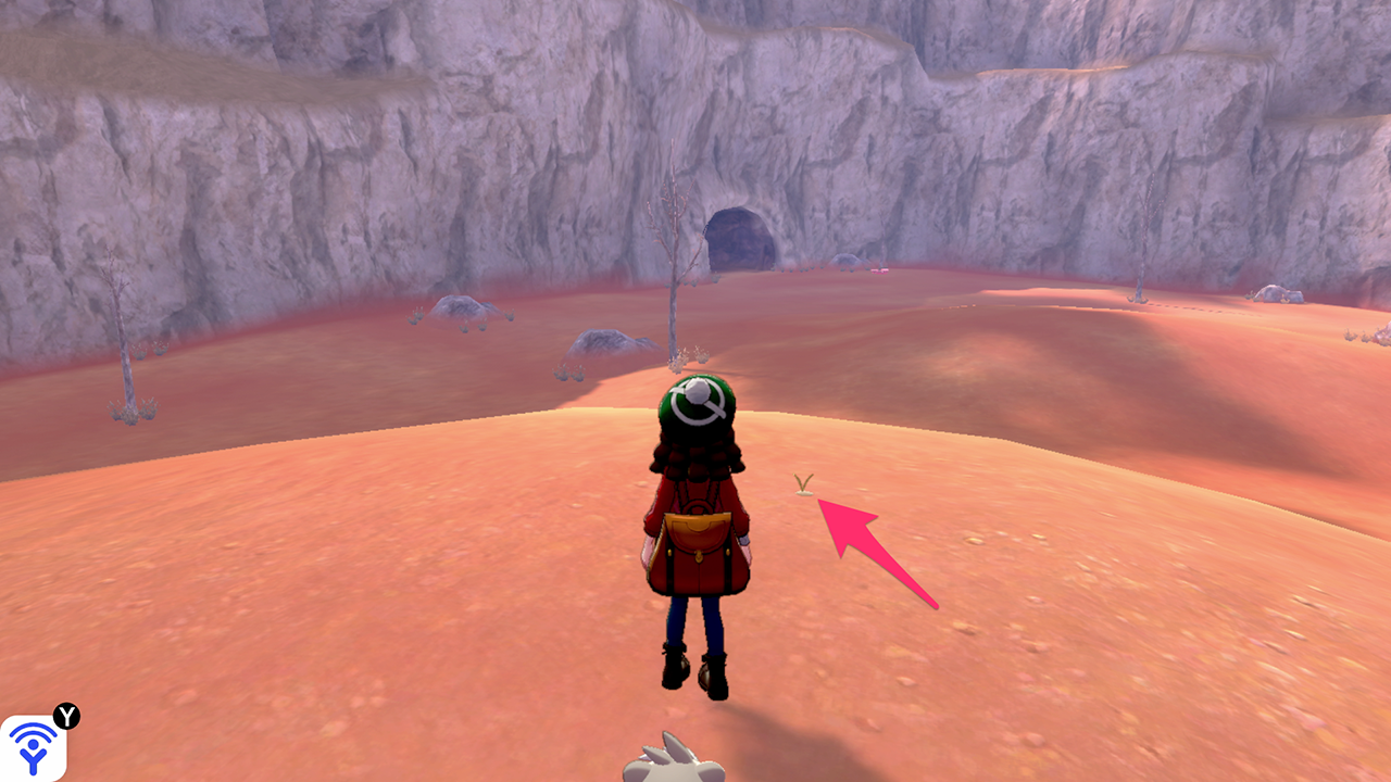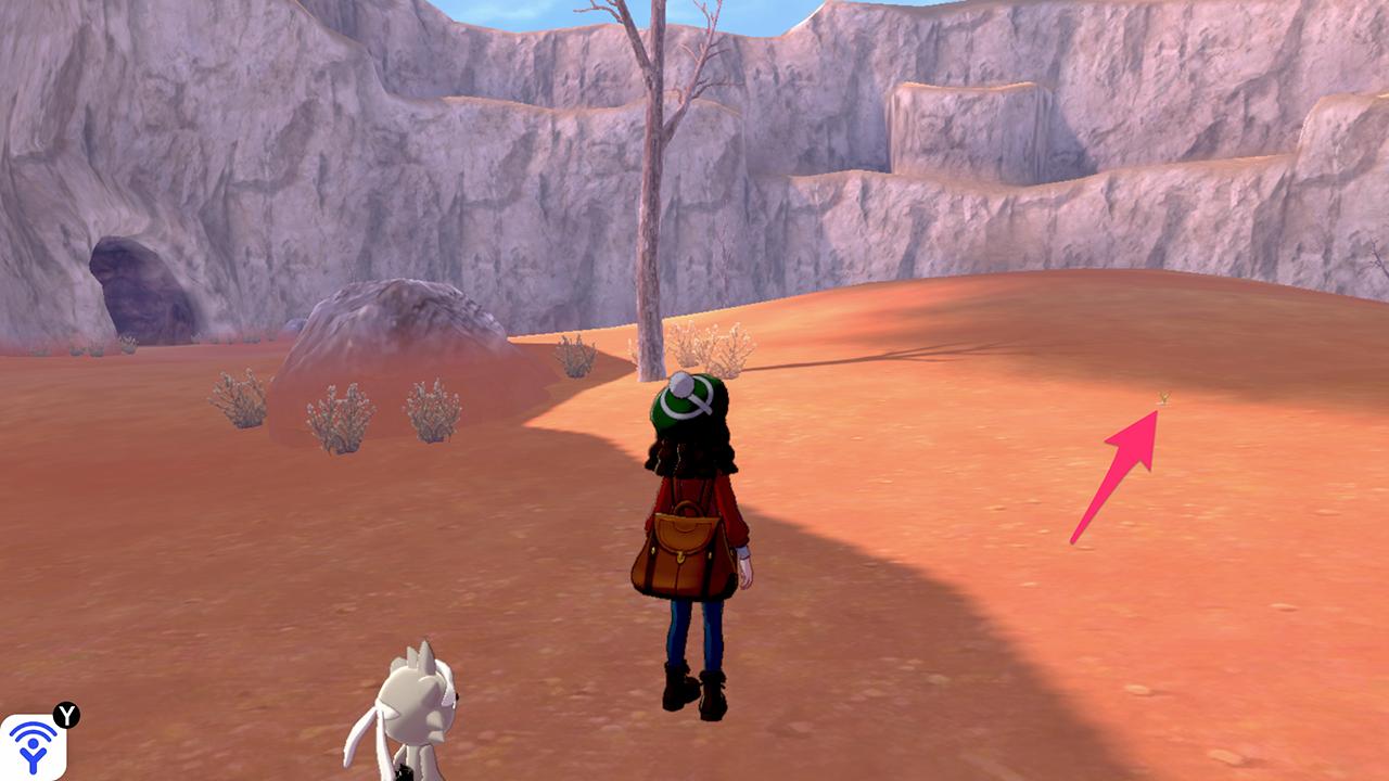 Keep walking along the outside wall of the desert, and you’ll eventually see a Pokemon Den off to your right. There’s a Diglett hiding next to a tree that’s near this Den.
