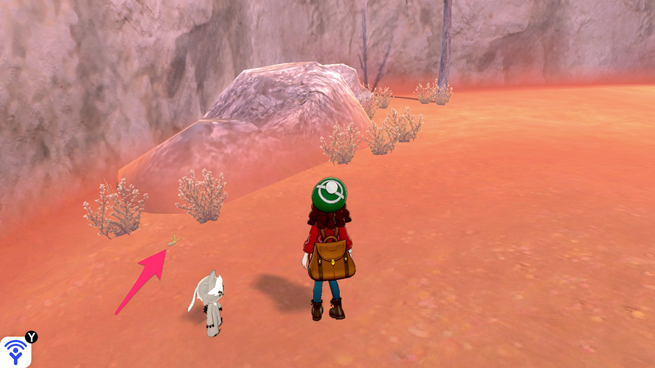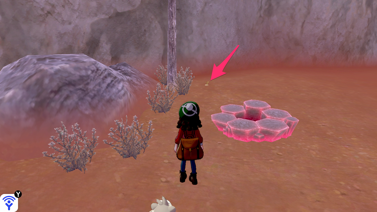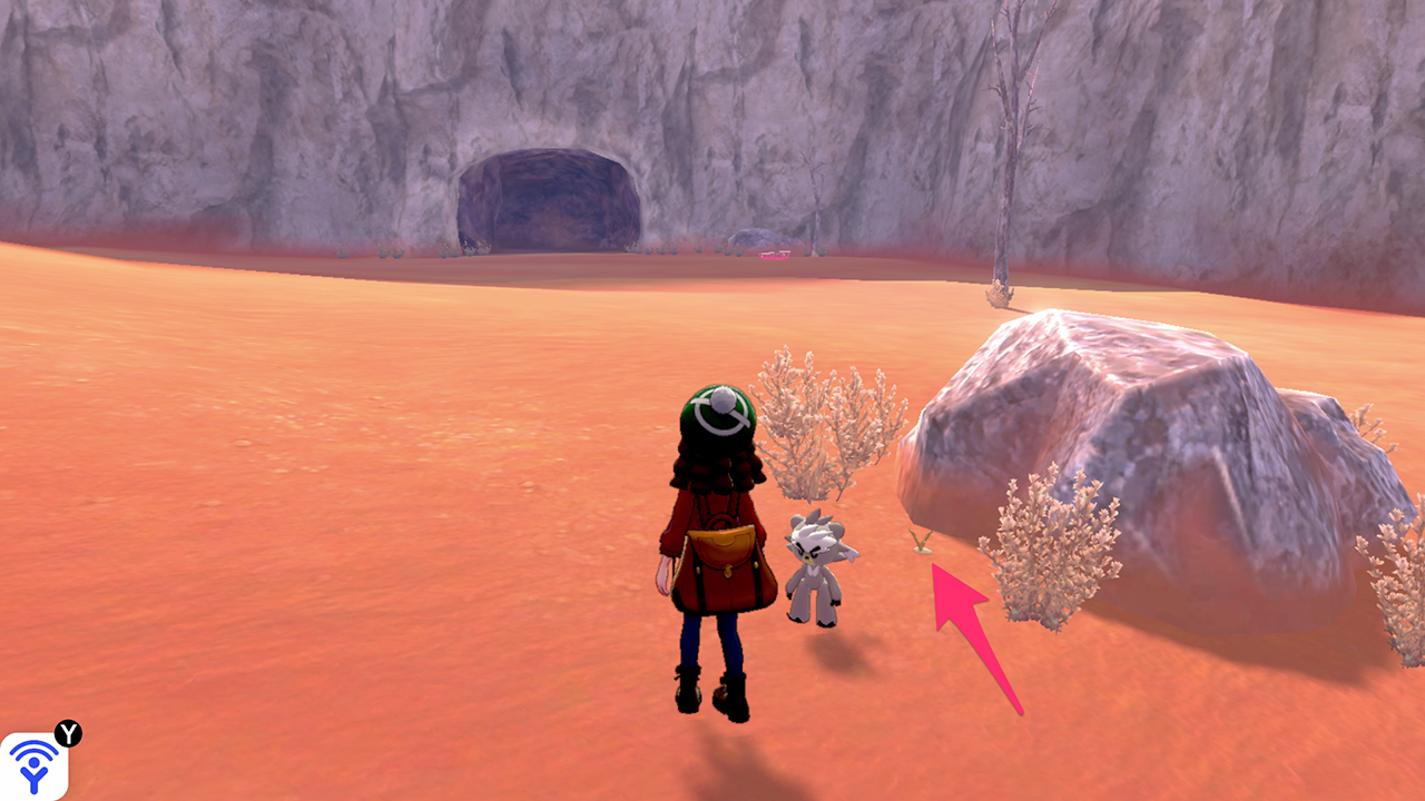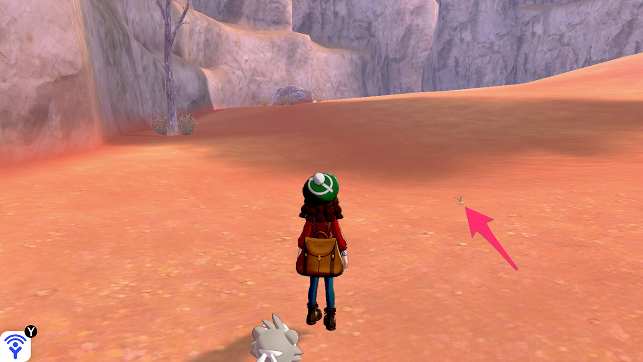 Keep walking along the outside wall of the desert, and you’ll eventually see a Pokemon Den off to your right. There’s a Diglett hiding next to a tree that’s near this Den.