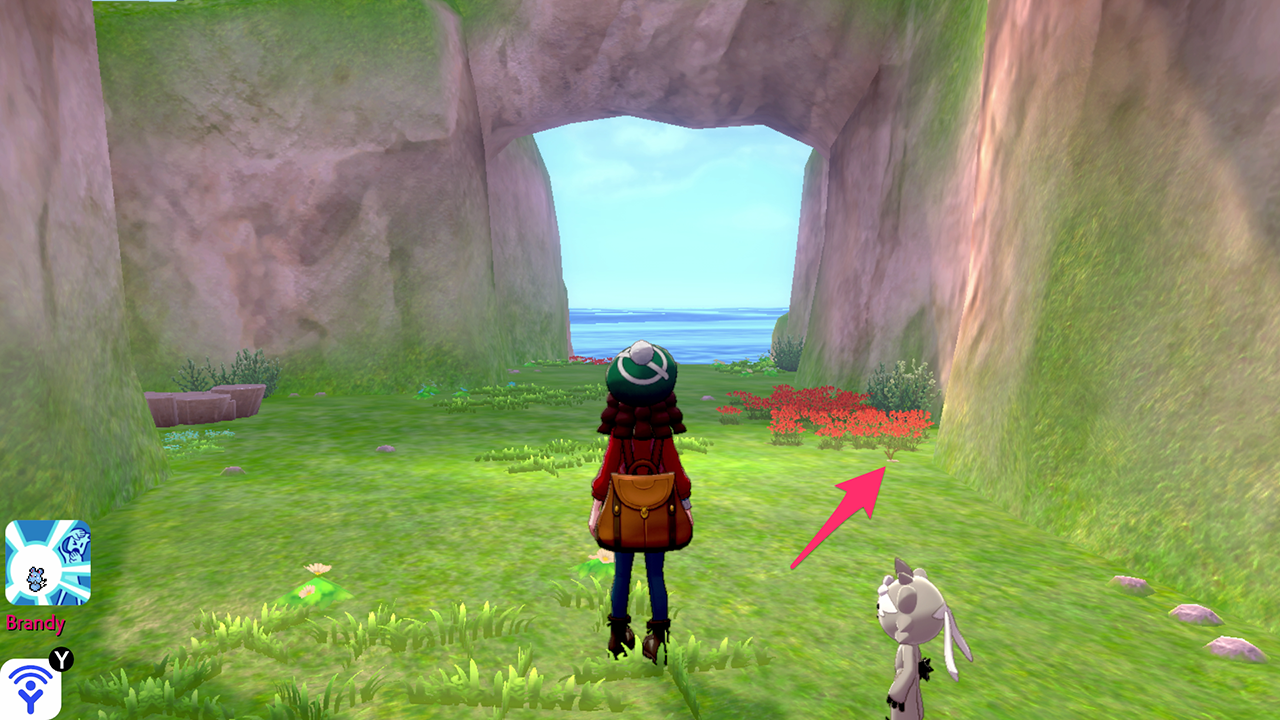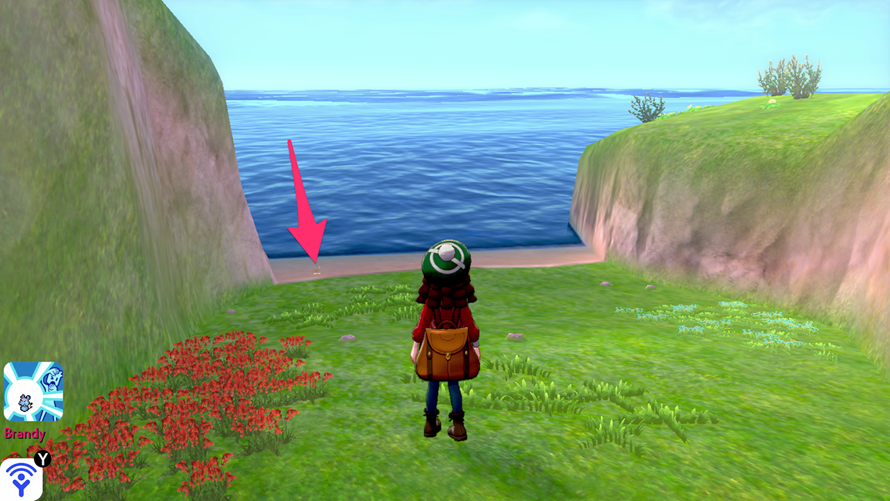 Now head back toward the end of the island that faces the Fields of Honor. Ride your bike into the water and turn left. You should see a small beach against the mountainside (we’re pointing to it in the first screenshot below). When you reach this beach, there’s a Diglett hiding in the sand near a berry tree.