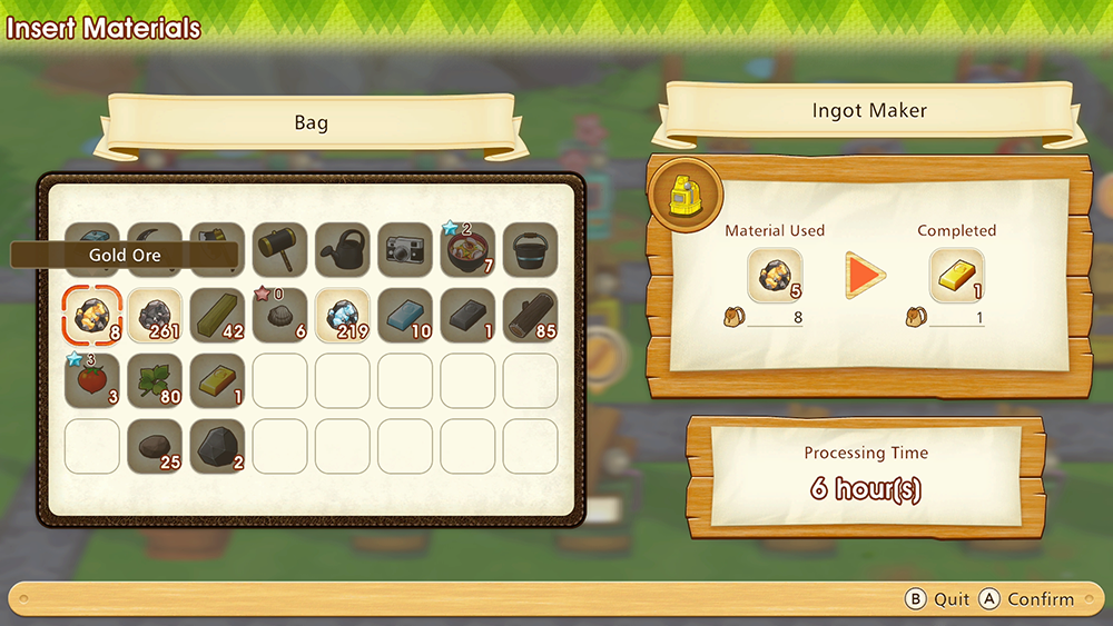 Different ores take different amounts of time to transform into ingots. For instance, five Iron Ore can be turned into an Iron Ingot in just two hours, but it takes six hours to transform five Gold Ore into a single Gold Ingot.
