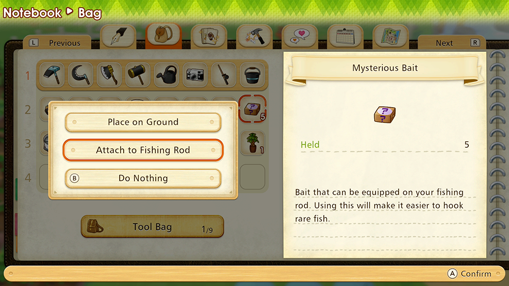 In order to connect bait to your fishing rod, open your inventory, highlight the bait you want to use, and then press “Y” to open the item’s menu.