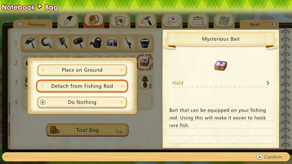 If you ever want to remove the bait you’re using, highlight the bait in your inventory, press “Y” to open the item’s menu, and select “Detach from Fishing Rod.”