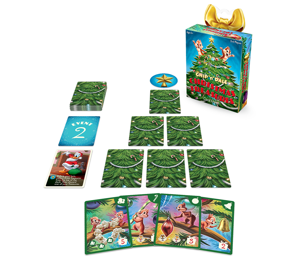 Chip ‘n’ Dale Christmas Treasures is a Disney-themed card game inspired by Disney’s Christmas cartoons from the 1950s. The game asks players to collect cards containing beautiful artwork of Chip ‘n’ Dale who are inside a Christmas tree while watching out for Pluto. The cards are arranged face-down on the table like a Christmas tree, and players can flip over one or more cards on each turn before deciding which one(s) to collect. Different cards and combinations of cards are worth varying amounts of points, and the player with the most points at the end of the game wins.